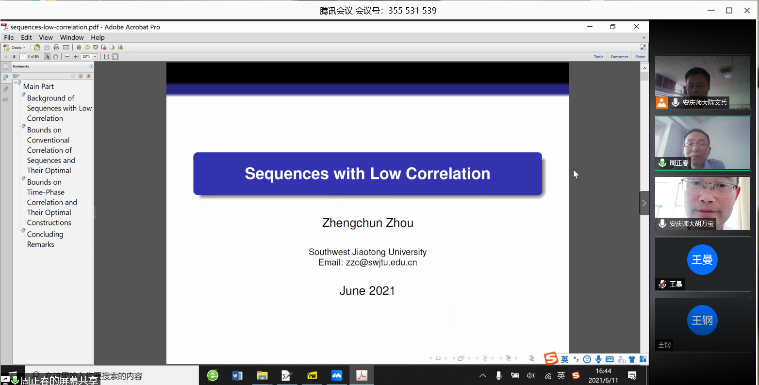 6月11日下午,西南交通大学数学学院周正春教授应太阳成集团tyc234cc邀请作了一场题为“Sequences with Low Correlation”的线上讲座报告。太阳成集团tyc234cc数学一级学科硕士点部分导师和研究生同学参加了本次报告会,报告会由太阳成集团tyc234cc胡万宝教授主持。