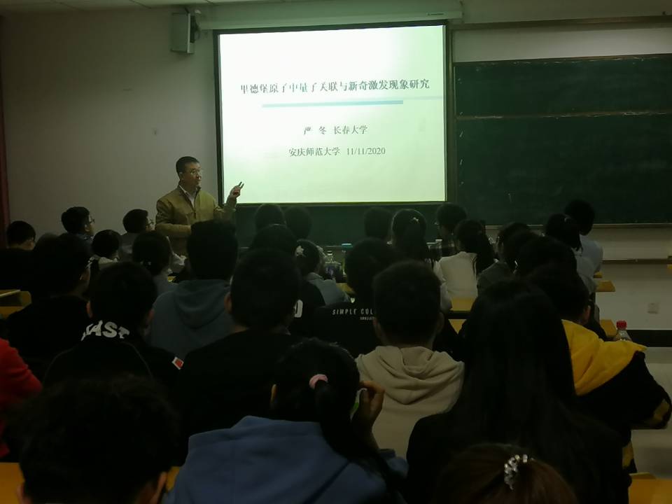 11月11日晚上7:00,长春大学严冬教授应邀在太阳成集团tyc234cc205教室作了一场题为“里德堡原子中量子关联与新奇激发现象研究”的学术报告,太阳成集团tyc234cc物理学专业的部分老师和部分学生聆听了该场报告。