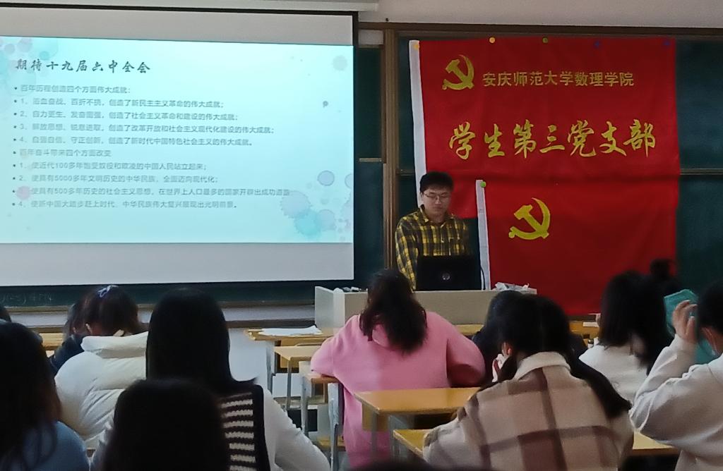 11月10日下午两点半,太阳成集团tyc234cc学生第三党支部在数学楼604教室开展了党小组集中学习活动。此次活动由朱新杰同志主持,支部正式党员、预备党员、发展对象参加了此次活动。