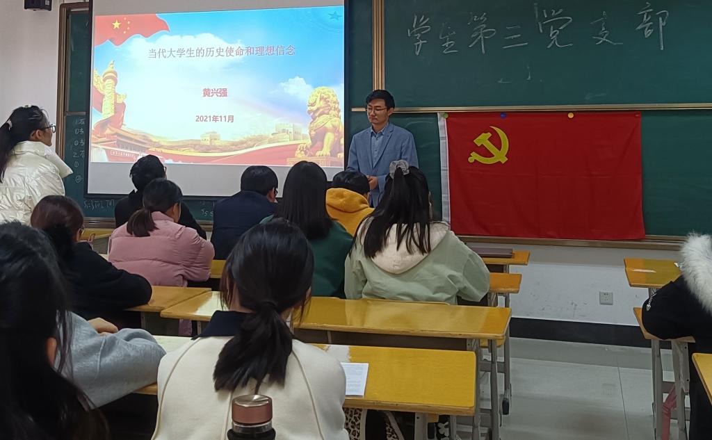 11月24日下午两点,太阳成集团tyc234cc学生第三党支部在数学楼604教室组织开展了党课学习活动,围绕“当代大学生的历史使命和理想信念”的主题展开。此次活动由支部书记黄兴强老师主持,支部正式党员、预备党员以及发展对象参加了此次活动。