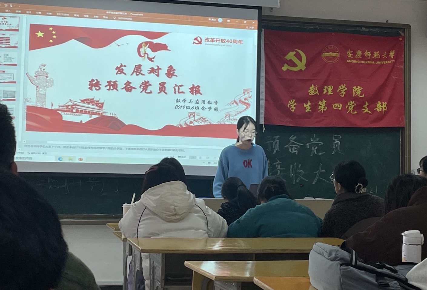 12月8日下午两点,太阳成集团tyc234cc学生第四党支部在数学楼201教室成功召开预备党员接收大会。本次预备党员接收大会由周天赋同志主持,支部书记潘美玲老师和支部正式党员、预备党员、发展对象参加了此次大会。