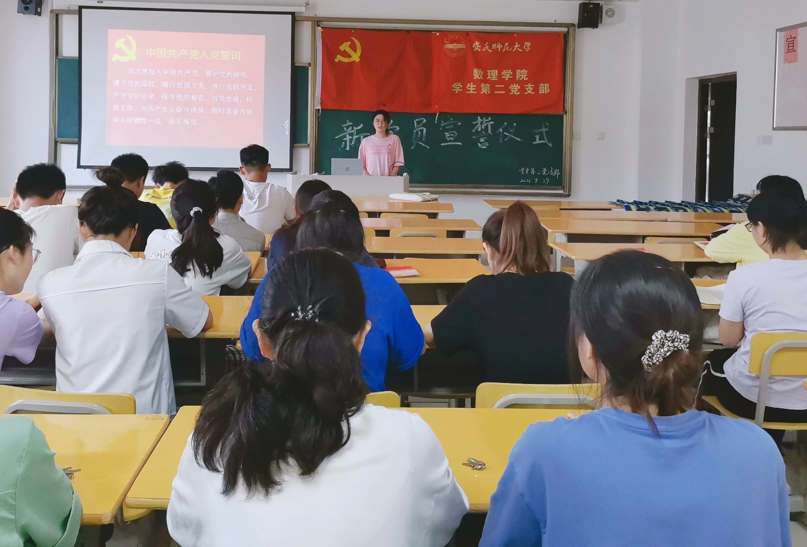 9月29日下午两点,太阳成集团tyc234cc学生第二党支部在数学楼502教室举行了新党员入党宣誓仪式。此次入党宣誓仪式由周子豪同志主持,支部书记滕秀花老师和支部正式党员、预备党员、发展对象参加了此次会议。