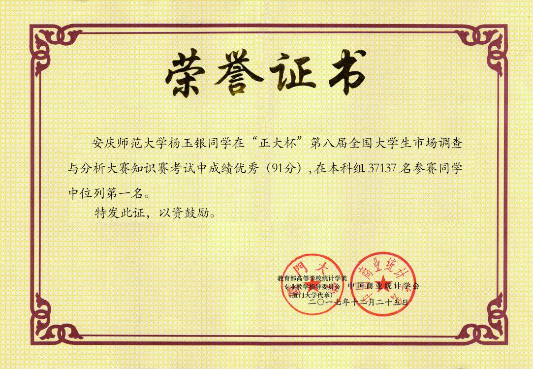 日前,“正大杯”第八届全国大学生市场调查与分析大赛知识赛成绩揭晓,我校2015级应用统计学2班杨玉银同学在本科组37137名参赛选手中位列第一名。