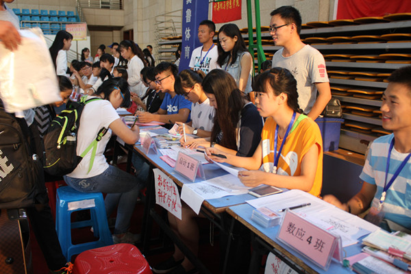 前台接待人员为新生办理报道手续,认真核对新生信息,收取录取通知书和准考证,发放住宿通知单、军训服装领取单和一卡通等报道材料,保证每一位新生及时准确报道。