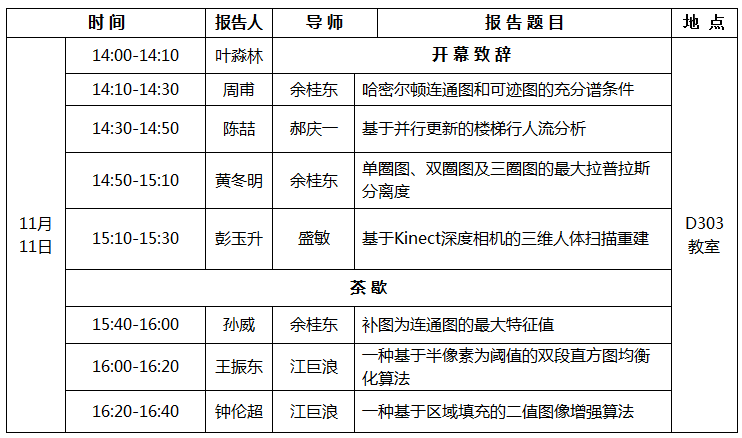 数学与计算科学学院院长叶淼林教授致开幕词,叶淼林院长对本次研究生学术活动月报告会举行表示热烈祝贺,并对全体在读研究生提出了殷切希望,希望本次活动能够激发研究生的学术热情,活跃学术思维,营造浓厚的学术之风、科研之风,逐步提高研究生独立从事科研的能力。随后,七位研究生同学通过PPT详细展示了自己已做或正在进行中的研究课题,课题涉及图论、交通流和图形图像处理等方面,与会导师们积极参与讨论并提出了许多建设性的意见或建议,会议气氛热烈。通过此次活动必将进一步提高我院研究生的学术素养、促进学术交流、增强团队凝聚力及创新意识,真正把学术活动月作为集中展示我院研究生办学成果的窗口。(数学与计算科学学院)