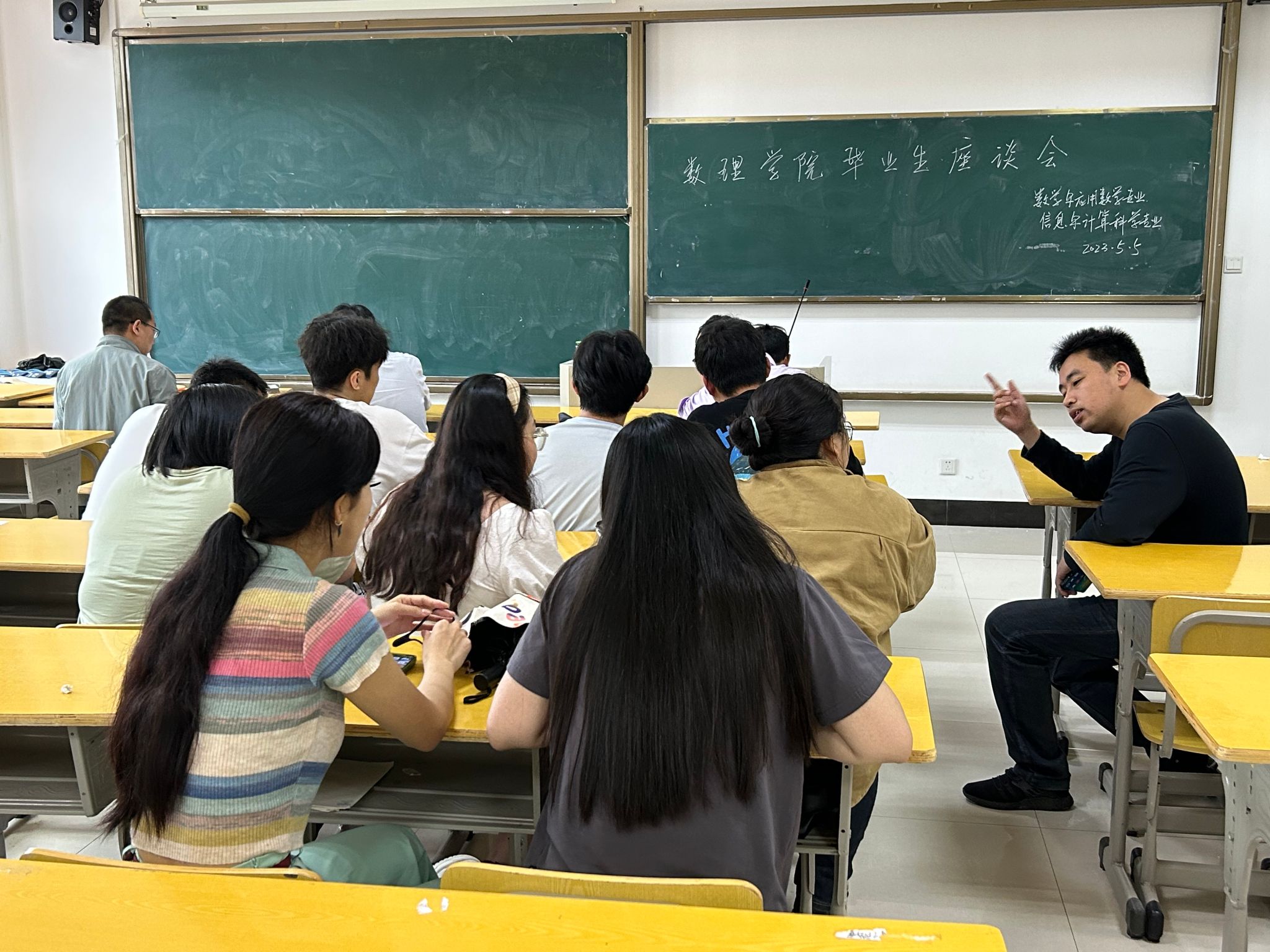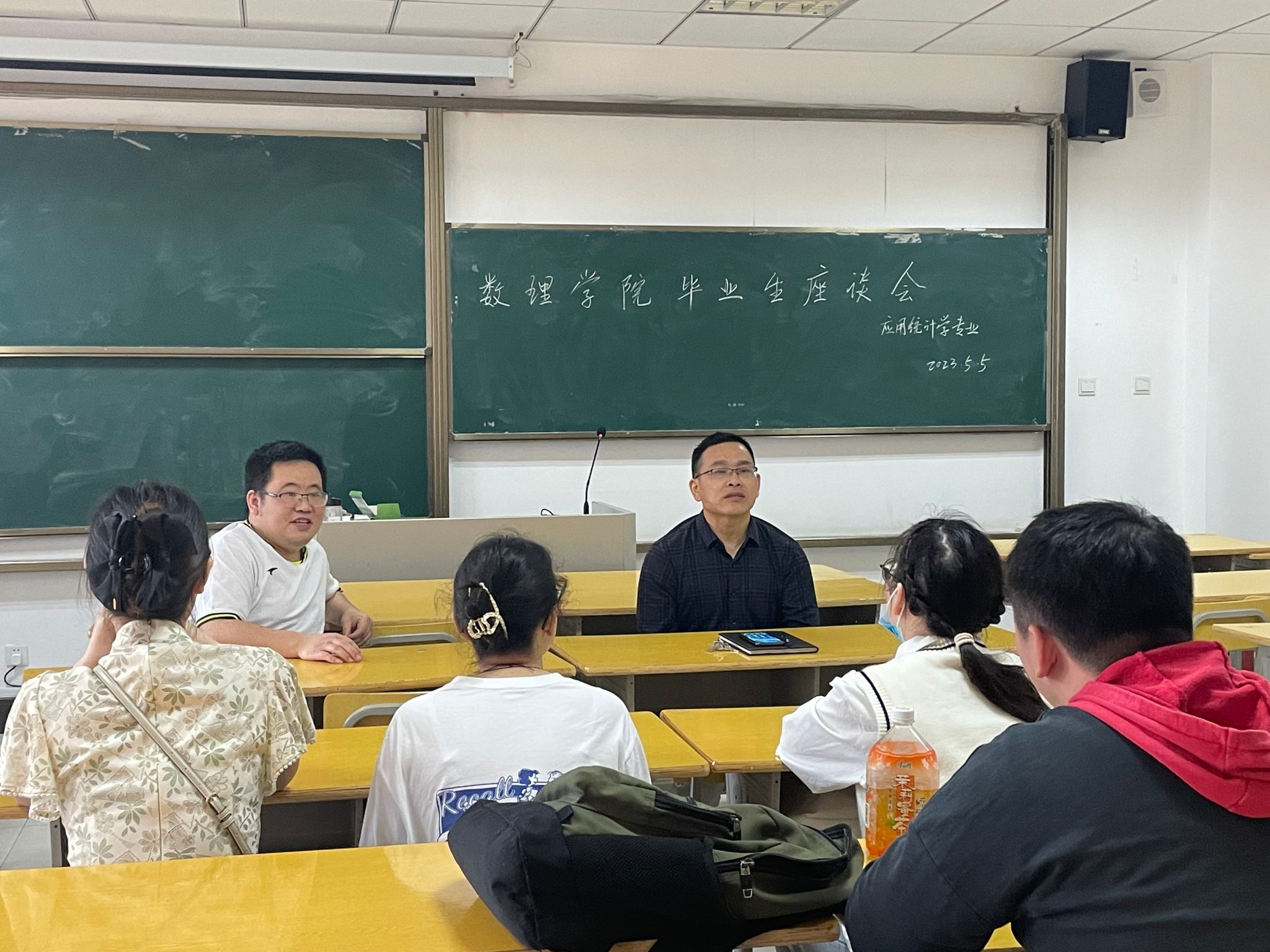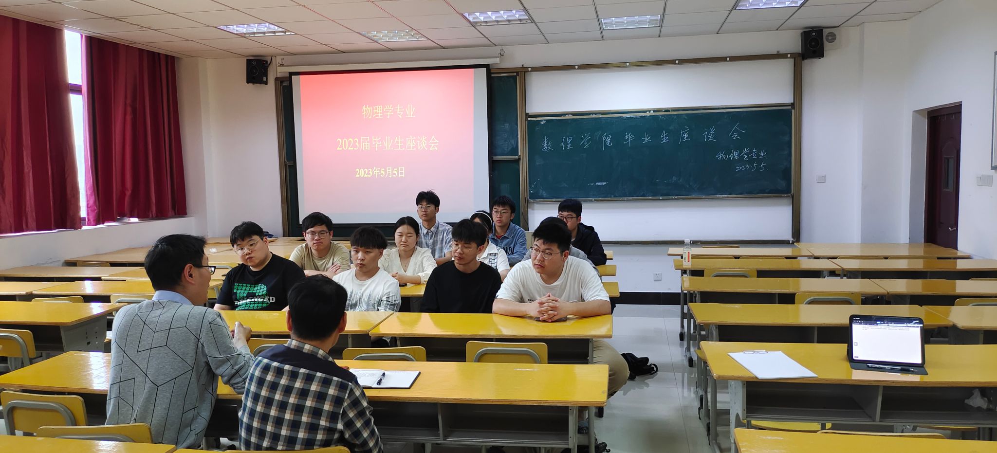 为做好2023版人才培养方案的顶层设计,广泛听取学生意见,5月5日中午,数学与应用数学、物理学、应用统计学、信息与计算科学等4个专业分别在数理楼204、502、503教室召开2023届毕业生代表座谈会。会议由各系主任主持,教研室主任、各专业毕业生代表、教学办公室工作人员参加了会议。