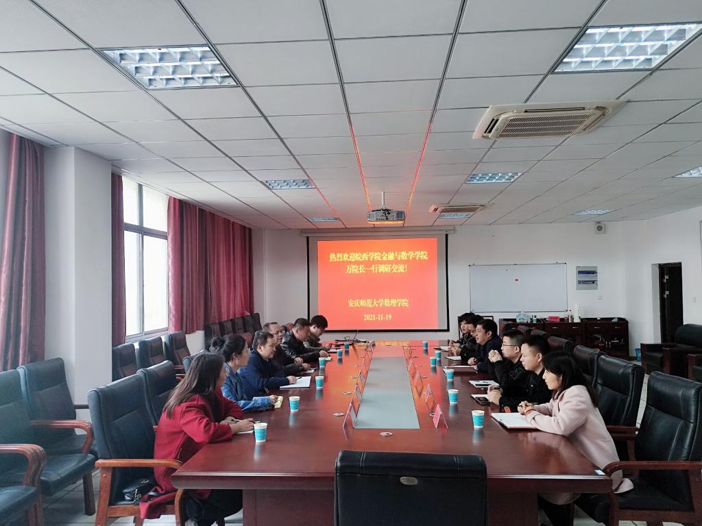 11月19日下午,皖西学院金融与数学学院院长万青、副院长周本达、教研室主任王修建、王为亮等一行6人来我院,围绕太阳成集团、数学与应用数学师范专业认证等主题展开研讨交流。太阳成集团tyc234cc副院长张海、数学系主任赵正俊、统计系主任胡学平、大学数学教学部主任舒阿秀等接待了皖西学院一行。