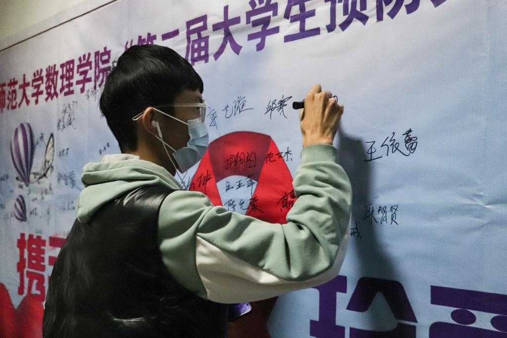 讲座前,所有同学都佩戴了象征“关心”和“希望”的红丝带并在签名墙上签名,许下“携手抗艾,珍爱生命”的诺言。
