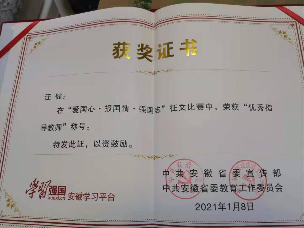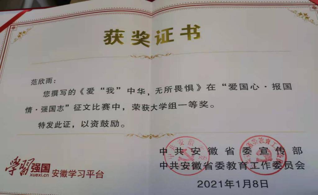 近日,由省委宣传部、省委教育工委主办,“学习强国”安徽学习平台承办的“爱国心•报国情•强国志”征文比赛结果揭晓,我院学生范欣雨的作品《爱“我”中华 无所畏惧》荣获大学组一等奖,汪健老师获得“优秀指导教师”称号,该优秀作品在“学习强国”学习平台获得了展示。