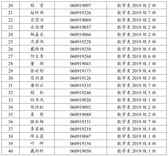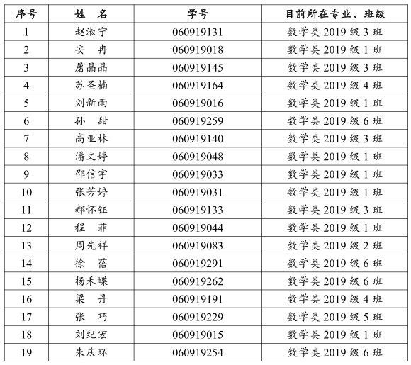 根据数学与计算科学学院《关于开展 “邓稼先班”学生选拔工作的通知》,2019级“邓稼先班”学生选拔工作组对学院申请学生进行了综合评定并公示,经数学与计算科学学院“邓稼先班”学生选拔领导组研究,决定录取赵淑宁等 40 名学生进入 2019 级“邓稼先班”学习,具体名单如下: