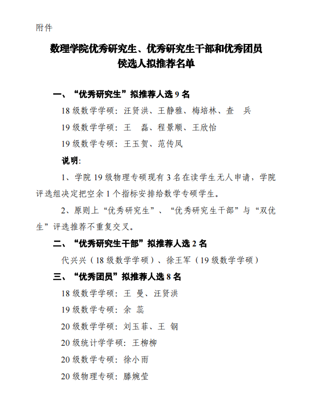 根据学校《关于做好2020-2021学年优秀研究生、优秀研究生干部评选工作的通知》和《关于评选2020年度共青团优秀个人和先进组织的通知》要求,经个人申报、研究生办公室汇总、学院评选组评审,评审结果报经学院领导班子审定通过,拟推荐汪贤洪等9名同学为“优秀研究生”候选人,代兴兴等2名同学为“优秀研究生干部”候选人,王曼等8名同学为“优秀团员”候选人(详见附件),现对上述人选进行公示。