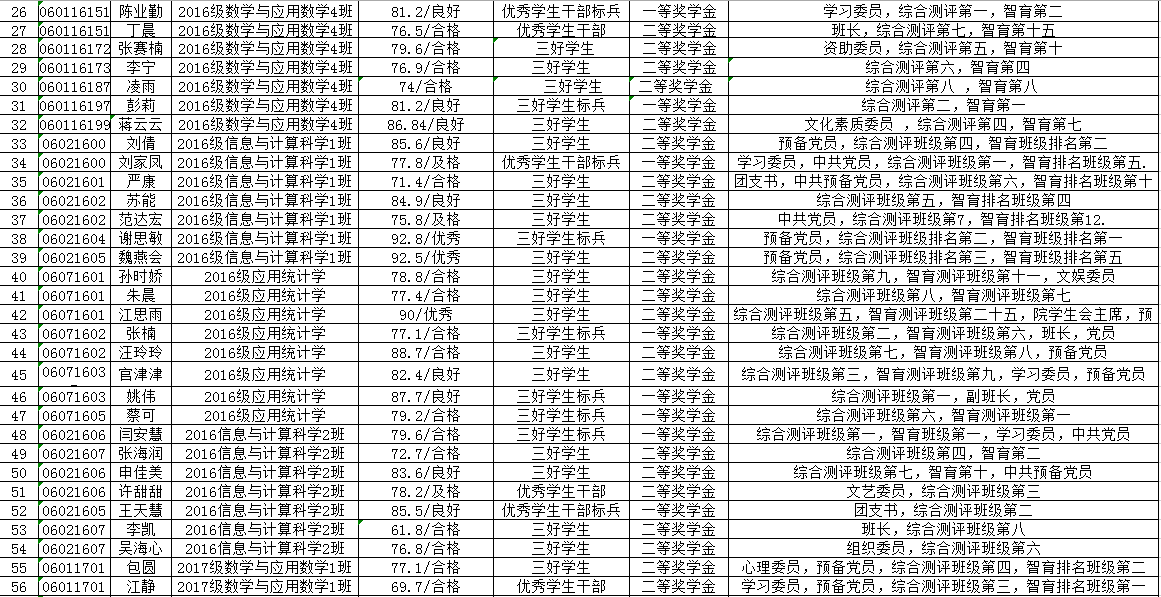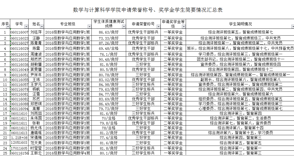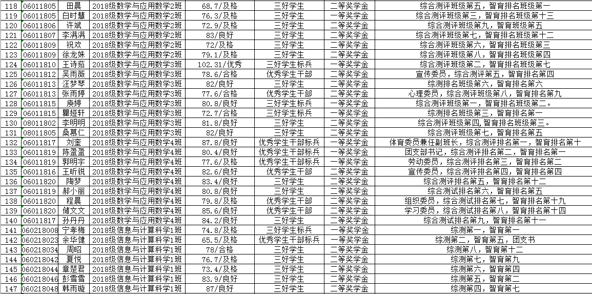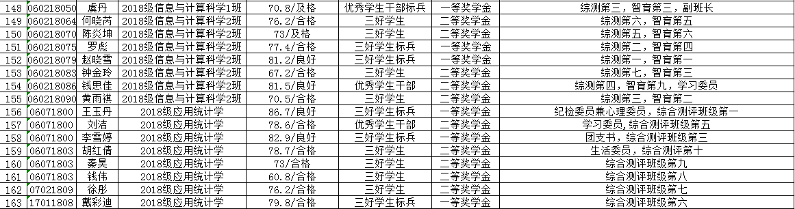 根据学校《关于做好2018—2019学年学生素质综合测评暨评优工作的通知》要求、经个人申请、各班级评议、学院学工组审核,拟同意刘钰萍等163名同学申请2018—2019年度学校一、二等奖学金和三好学生标兵、优秀学生干部标兵、三好学生、优秀学生干部等荣誉称号,并予以公示。