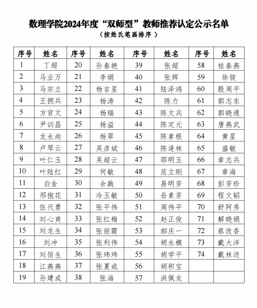 根据《太阳集团tyc234cc“双师型”教师认定管理办法》(校政字〔2024〕11号)和学校《关于开展 2024年度“双师型”教师认定工作的通知》精神和要求,经教师个人申请、学院教学工作委员会审议、党政联席会议研究,拟向学校推荐认定丁超等74位教师为“双师型”教师,现予以公示(详见附件)。