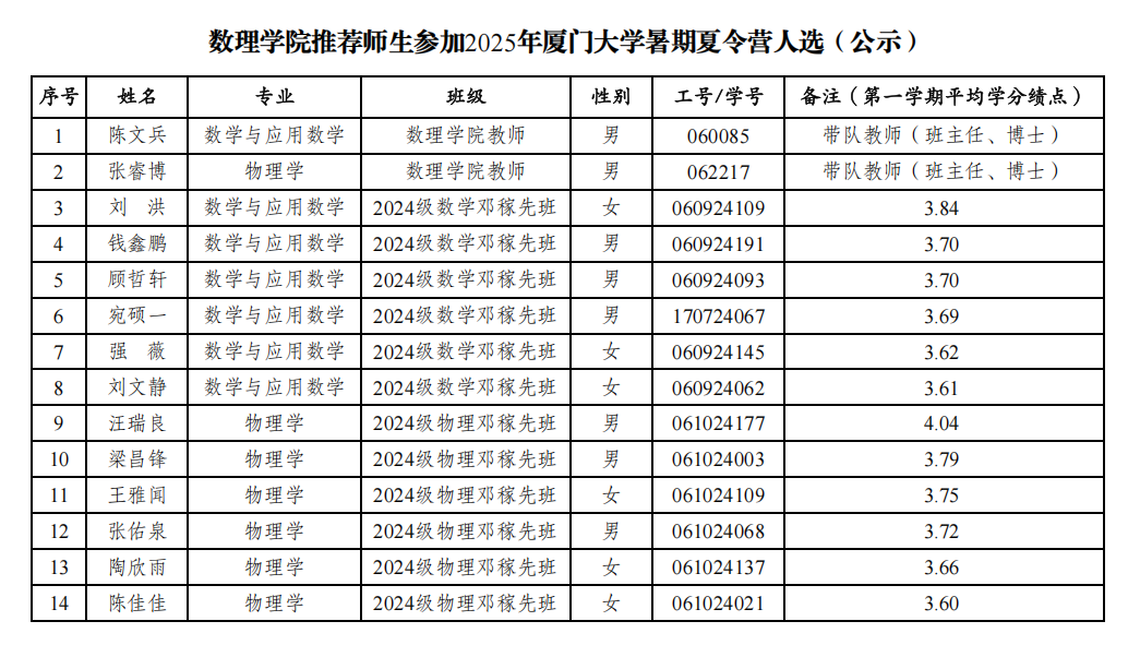 根据学校《关于开展卓越拔尖试点班2025年暑期夏令营工作的通知》要求,经个人申请、太阳成集团tyc234cc党委会和党政联席会议研究,决定拟向学校推荐陈文兵等14名师生参加2025年暑期厦门大学夏令营活动,具体推荐人选公示如下: