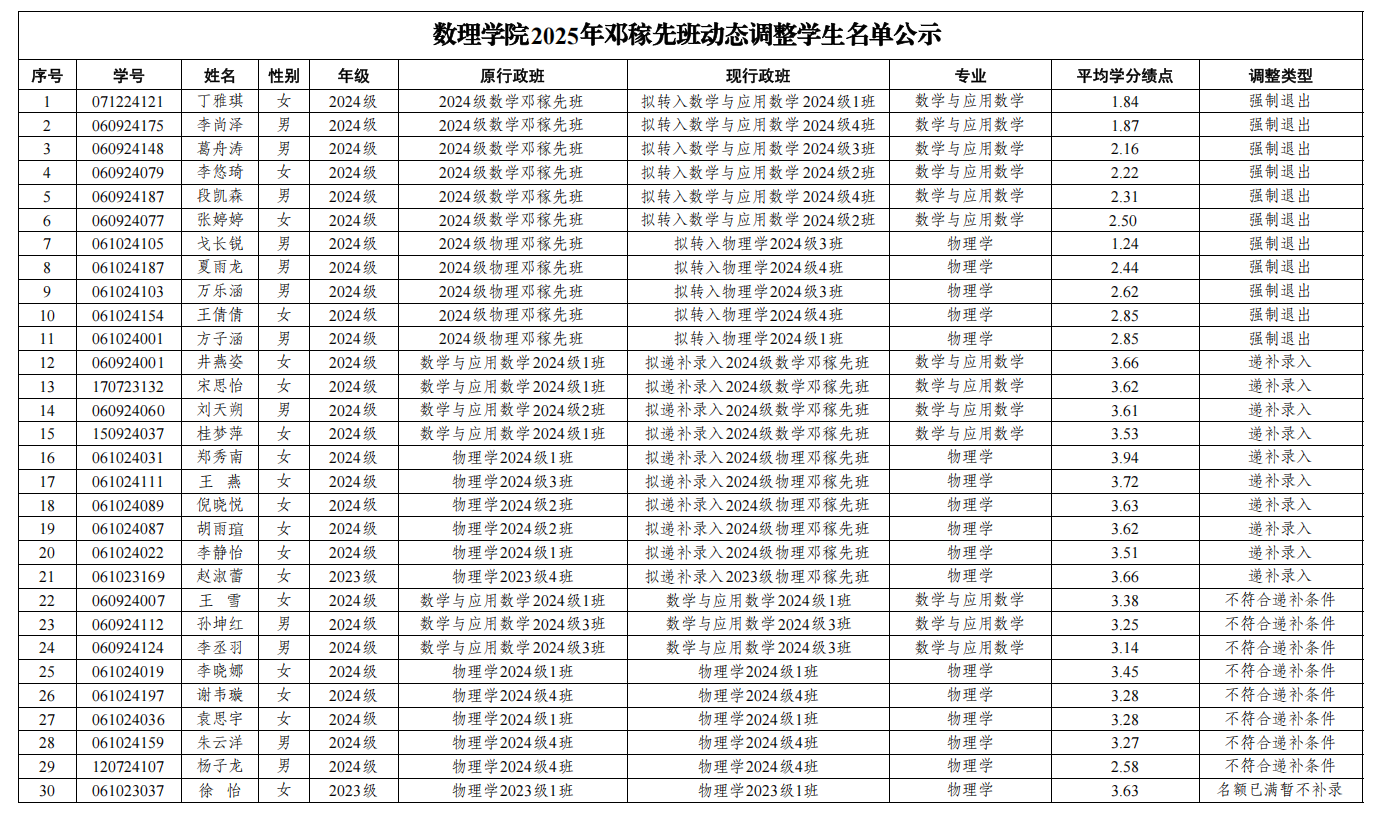 根据学校《关于开展卓越拔尖班动态调整工作的通知》《太阳成集团tyc234cc关于开展2025年邓稼先班学生递补选拔工作的通知》精神和要求,经学生自愿申请、太阳成集团tyc234cc党委会和党政联席会议研究,现将2025年邓稼先班学生动态调整结果公示如下: