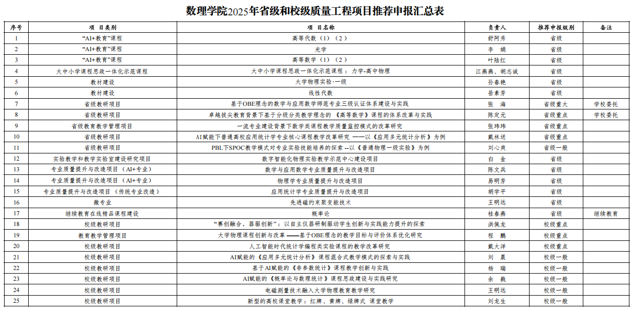 根据学校《关于开展2025年度省级和校级质量工程项目申报工作的通知》要求,经个人申报、学院教学工作委员会评审、学院党政联席会议审定,拟向学校推荐舒阿秀等25位教师分别申报2025年度省级和校级质量工程项目,现将申报推荐结果公示如下: