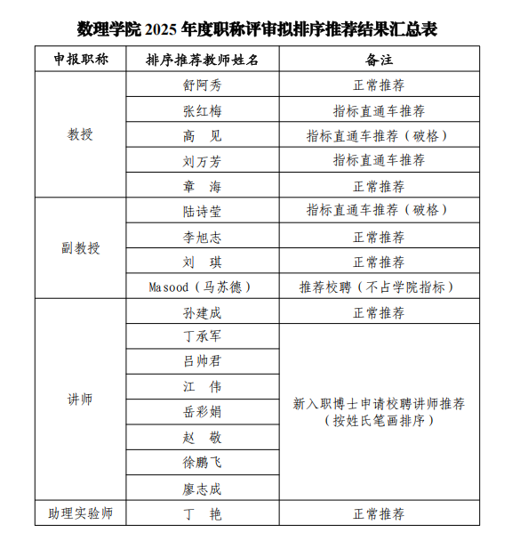 根据《安徽省普通本科高等学校教师专业技术资格申报条件》(皖教人〔2016〕1号)、《安徽省高校实验系列专业技术资格评审标准条件的通知》(皖教人〔2022〕2号)、《关于做好太阳集团tyc234cc2025年度职称推荐评审工作的通知》(校政秘〔2025〕78号)等文件精神,太阳成集团tyc234cc2025年职称评审推荐组于2025年12月5日召开评审会,对本次申报职称教师进行资格条件审核、评议,并进行投票推荐,排序推荐结果经太阳成集团tyc234cc党委会研究、党政联席会议审定,现将排序推荐结果予以公示(详见附件)。