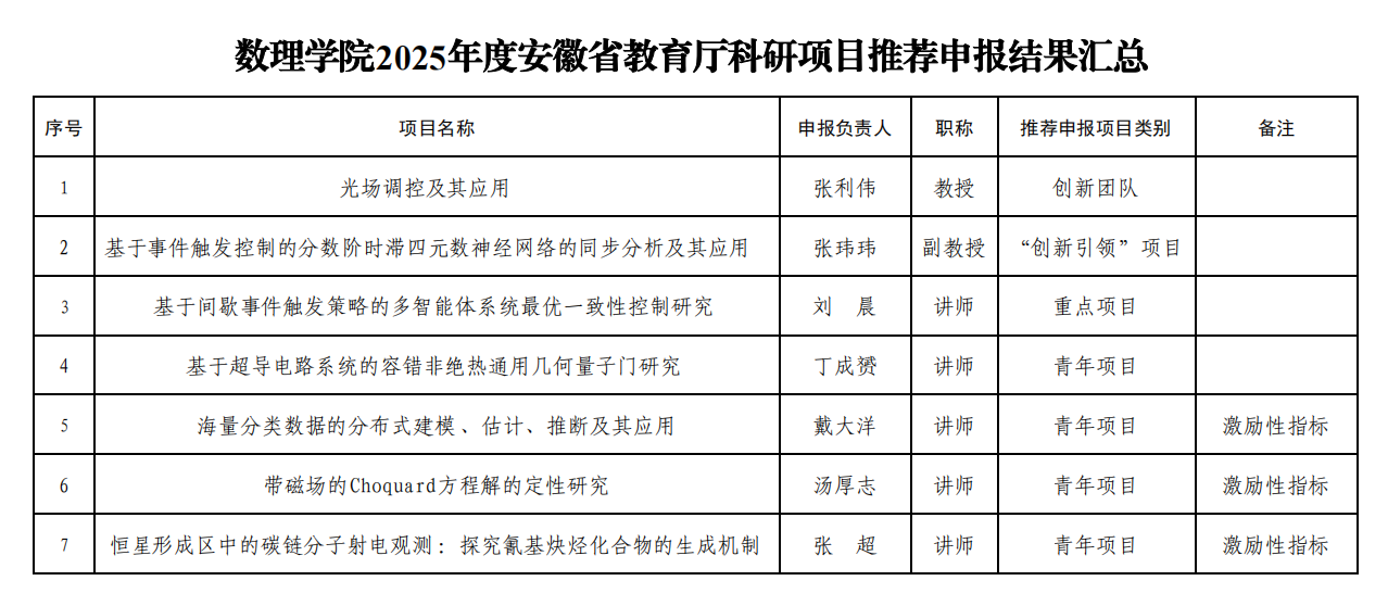 根据学校《关于组织申报安徽省教育厅2025年度科研项目的通知》要求,经教师个人申报、学院学术委员会评审、学院党政联席会议审定,拟向学校推荐申报2025年安徽省教育厅科研项目7项,现公示如下: