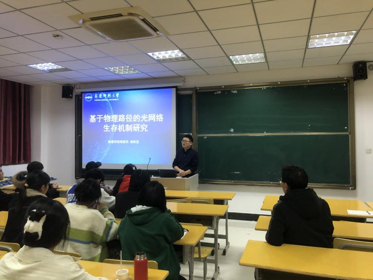 2022年11月18日晚,太阳成集团tyc234cc胡积宝副教授在I503作“基于物理路径的光网络生存机制研究”学术报告,物理系主任张平伟副教授主持会议,物理学专业本科生和部分研究生聆听了报告。