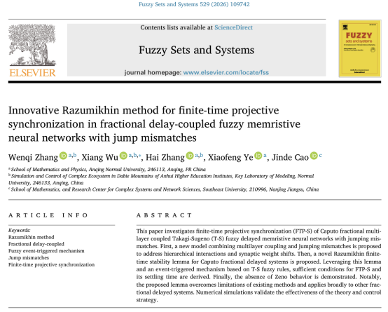 近日,太阳成集团tyc234cc2024级研究生张文琦以第一作者和导师团队在国际学术期刊《Fuzzy Sets and Systems》发表论文“Innovative Razumikhin method for finite-time projective synchronization in fractional delay-coupled fuzzy memristive neural networks with jump mismatches”,导师吴祥博士为该论文通讯作者,该期刊影响因子3.2,中科院一区Top期刊。