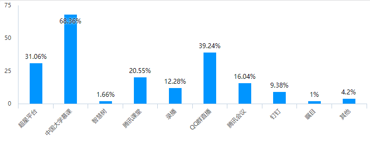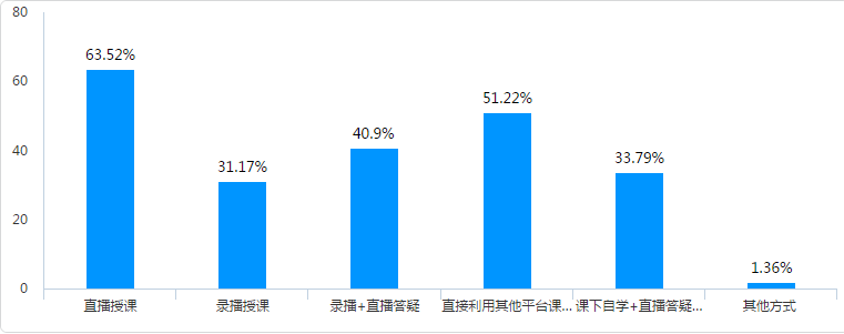 授课教师采用的线上授课方式:教师授课方式多样,都根据课程特点选择了适合自己的教学方式。教师线上授课方式从多到少依次为直播授课占63.52%,直接利用其它平台课程资源占51.22%,录播+直播答疑占40.9%,课下自学+直播答疑占33.79%,录播授课占31.17%,其他方式占1.36%。大部分教师采取直播授课方式,可能考虑到学生需要更多的课程直观体现和更多的交流互动,相比录播授课和自学辅导答疑,直播授课方式能够较好满足学生需求。