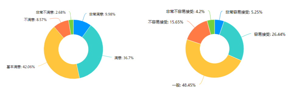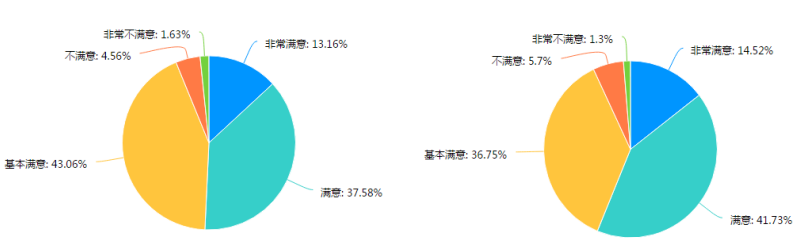 学生对教师授课情况的满意度:学生对教师线上教学满意度方面,调查结果显示,97.07%的同学对学院教师的线上教学态度表示“非常满意”“满意”或“基本满意”;95.93%的同学对学院教师的教学设计和教学实施过程表示“非常满意”“满意”或“基本满意”;对老师线上突出重点、化解难点、讲授熟练与清晰透彻方面,93%的同学表示“非常满意”“满意”或“基本满意,但也有7%的同学持相反态度,说明教师还需要进一步优化创新教学设计,争取获得所有同学的认可。