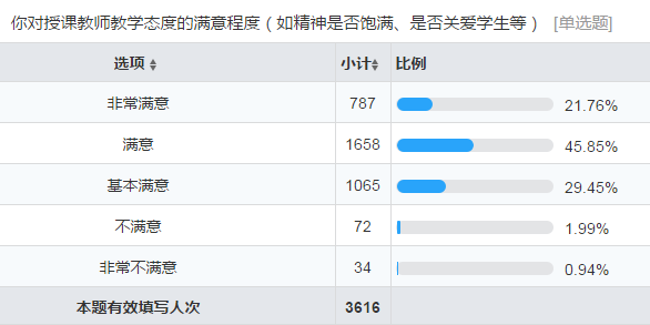 问卷调查结果及质量分析。截至3月29日,共收集学生有效问卷3616份,学院教师有效问卷65份。经过对问卷数据进行统计,分析结果如下: