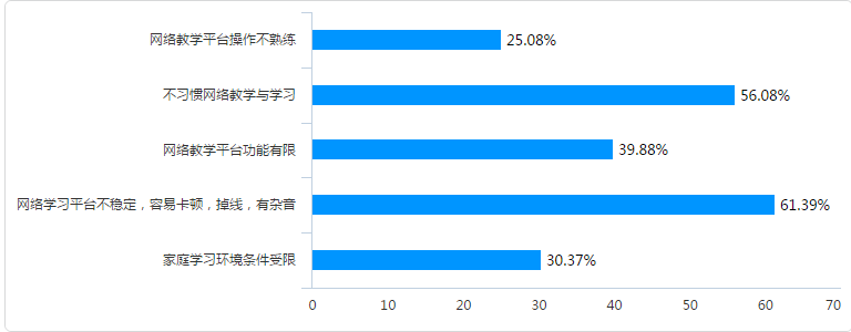 影响学生使用线上课程学习平台的主要因素情况(问卷中设置多项选择),调查对象中61.39%的学生认为网络学习平台不稳定,容易卡顿,掉线,有杂音,56.08%的学生不习惯网络教学与学习,39.88%的学生认为网络教学平台功能有限,30.37%的学生家庭学习环境条件有限,25.08%的学生网络教学平台操作不熟练。
