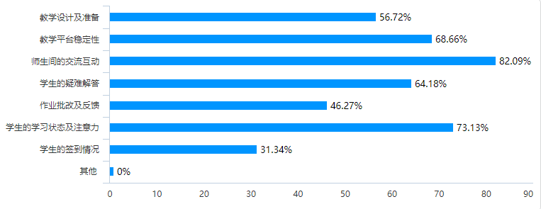 授课教师开展线上教学注重的教学环节:问卷调查结果显示(问卷中设置多项选择),调查对象中83.08%的教师认为应该注重师生间的交流互动,72.31%的教师认为应该注重学生的学习状态及注意力,69.23%的教师认为应该注重教学平台的稳定性,64.62%的教师认为应该注重学生疑难解答,58.46%的教师认为应该注重教学设计与准备环节,47.69%的教师认为应该注重作业批改和反馈,32.31%的教师认为应该注重学生的签到情况,这说明线上教学师生互动是授课教师最关注的环节,也是众多教师选择直播授课方式的原因之一。