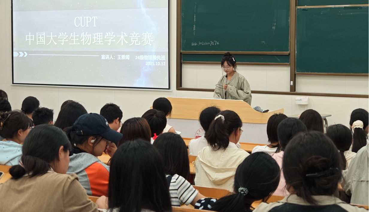 为积极落实学院学科竞赛培育计划,激发学生科研与创新热情,太阳成集团tyc234cc于10月12日晚在教学楼C208举办了2026年【竞赛领航】活动第一期——中国大学生物理学术竞赛(CUPT)专场宣讲。本次活动由太阳成集团tyc234cc指导、太阳集团tyc234cc大学生科学技术协会(SAST)承办,是年度系列活动的重要组成部分。