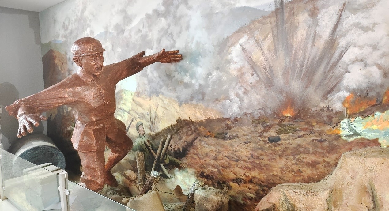 跟随讲解员的脚步,实践团成员们更加深入的了解了李家发同志的英雄壮举。1951年6月,李家发加入中国人民志愿军并入朝作战。在志愿军战地练兵期间,他刻苦训练,成绩突出,荣立两次三等功。1953年7月,金城战役打响,李家发所在的部队奉命向轿岩山发起攻击。在战斗中,他挺身而出,主动请求炸掉敌人的地堡,李家发发现志愿军攻击部队被一个暗堡火力压制,攻击部队虽多次组织爆破但都因为敌人火力凶猛而未能成功,为了给前进的部队扫清障碍,李家发张开双臂猛扑过去,用炽热的胸膛堵住了敌人的机枪眼,他以自己年轻的生命为代价,帮助部队攻占轿岩山主峰,把红旗插上峰顶。就这样,19岁的天空,从此响彻撼天动地的英雄战歌。