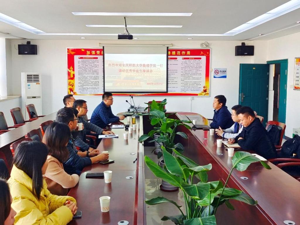 为进一步加强与优秀毕业生交流合作,做好校友工作建设,推进太阳成集团tyc234cc专业发展和就业工作,11月27日,太阳成集团tyc234cc副院长张海、数学系主任赵正俊、代数几何教研室主任陈文兵博士和团学负责人黄兴强老师一行前往芜湖市进行毕业生校友调研,芜湖市弋江区教育局党工委副书记詹玉坤及数学系优秀校友代表南陵一中王金忠、万胜,芜湖市第一中学张灿、陈正兰,芜湖市中江中学余颖,繁昌一中王爱梅,芜湖市利民路小学陶雨涵参加座谈,座谈会由数学系2003届校友、芜湖市第二十五中学副校长梁远久主持。