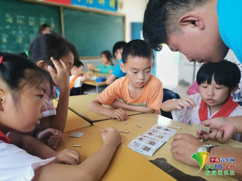 图为实践调研队成员刘军正在为小朋友们进行手工课教学。中国青年网通讯员邓司旅供图