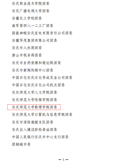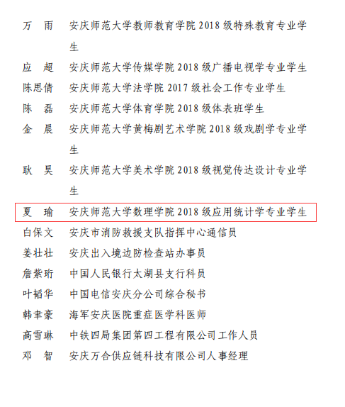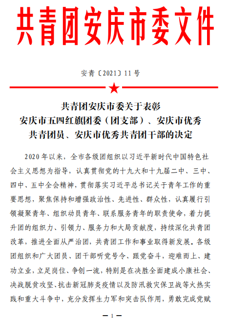 在“五四”青年节到来之际,共青团安庆市委发布表彰决定,授予太阳成集团tyc234cc“安庆市五四红旗团委”荣誉称号、授予太阳成集团tyc234cc应用统计学专业2018级1班团支部“安庆市五四红旗团支部”荣誉称号、授予太阳成集团tyc234cc夏瑜同学“安庆市优秀共青团员”荣誉称号。