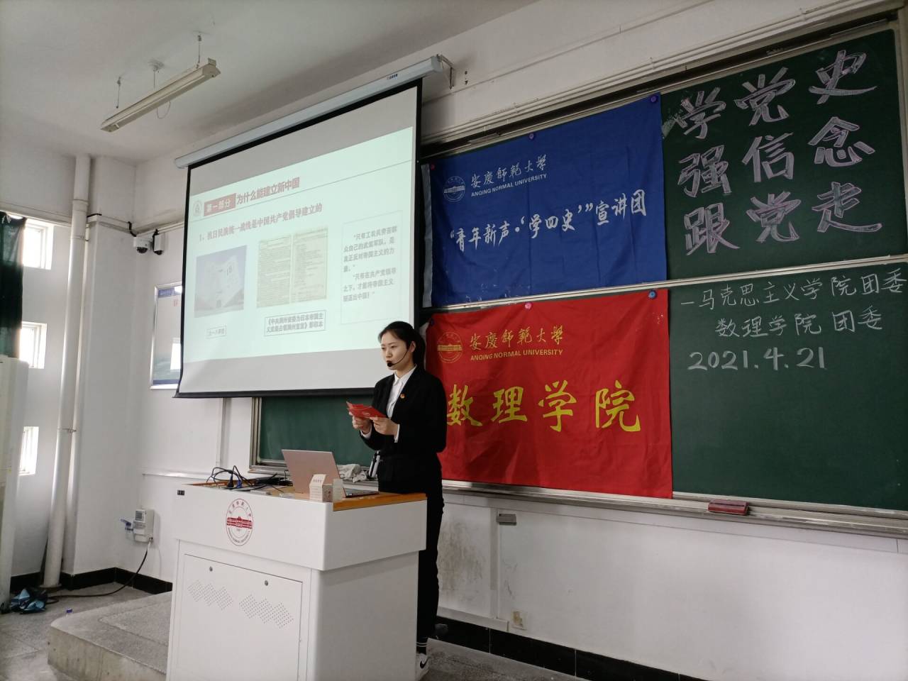 为推进党史学习教育深入开展,全面提升青年学子们的政治素质和党性修养,教育引导青年学子们做到“学史明理、学史增信、学史崇德、学史力行”,4月21日下午,太阳成集团tyc234cc团委特邀马克思主义学院“四史”宣讲团于文源楼305教室举办以“学党史、强信念、跟党走”为主题的党史宣讲会。太阳成集团tyc234cc团委负责人汪健、马克思主义学院“四史”宣讲团指导教师方伟和近百余人学生参与了此次大会。