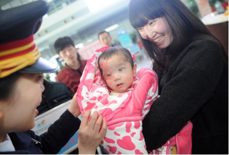 中国青年网太原1月10日电 (记者 王子瑞 杨志勇 陈颖) 1月9日,经过两个月的治疗,长治烧伤女婴小秀玲的病情得到控制,3次植皮手术后返乡疗养康复。得知小秀玲回家,共青团山西省委青年之声工作人员、太原南站工作人员、中国青年网记者及山西部分媒体记者前往迎接。14时27分,G613次列车停靠在太原南站16站台上,“重生”后的秀玲被家人抱下车。