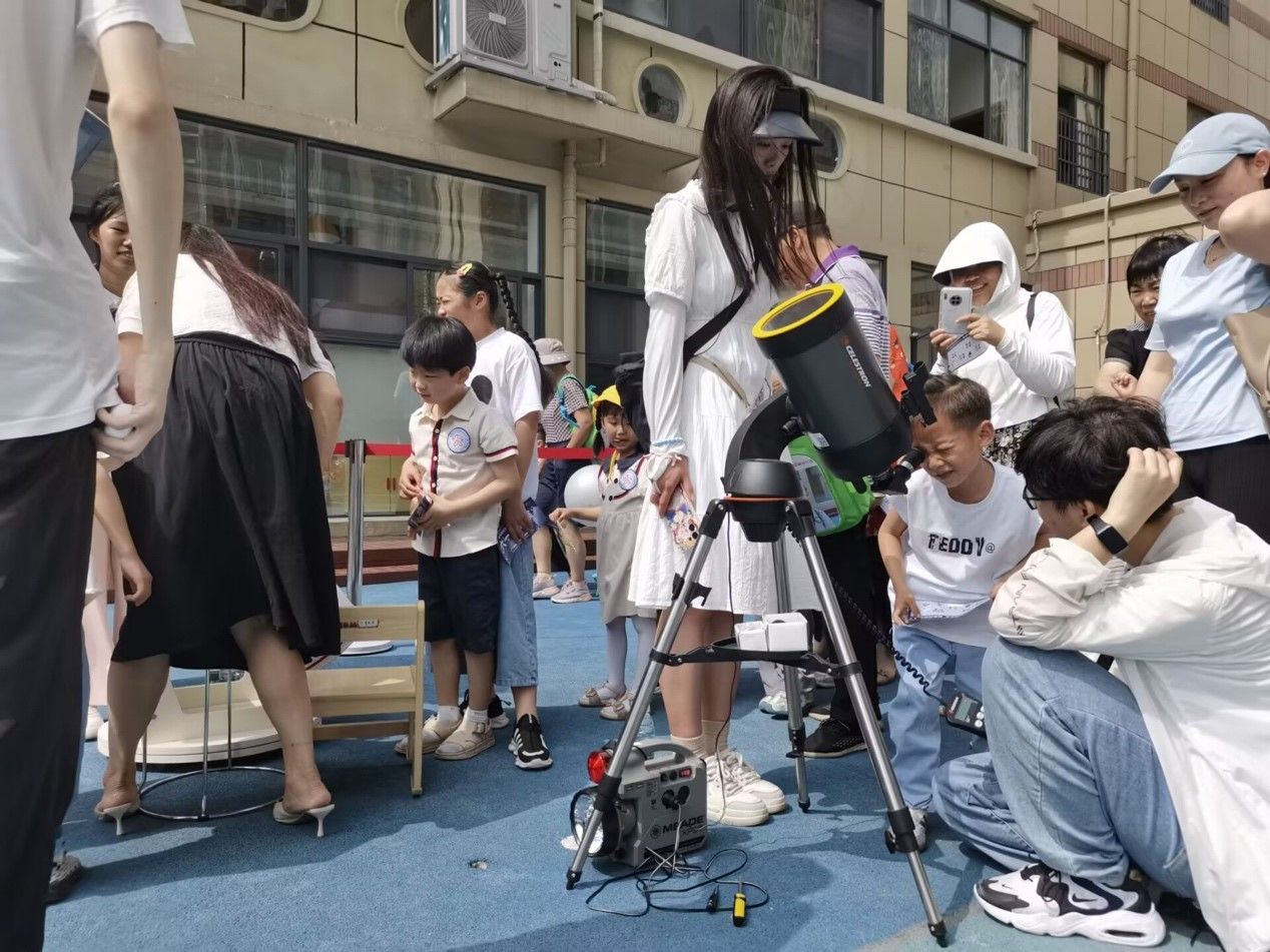 6月1日国际儿童节,太阳集团tyc234cc大学生天文爱好者协会与校附属龙城幼儿园共同举办太阳黑子科普观测活动。本次活动,天文协会提供了配备太阳滤镜,适合小朋友观测的地平式和道布森式望远镜各一台,并由协会理事对太阳黑子进行科普讲解。