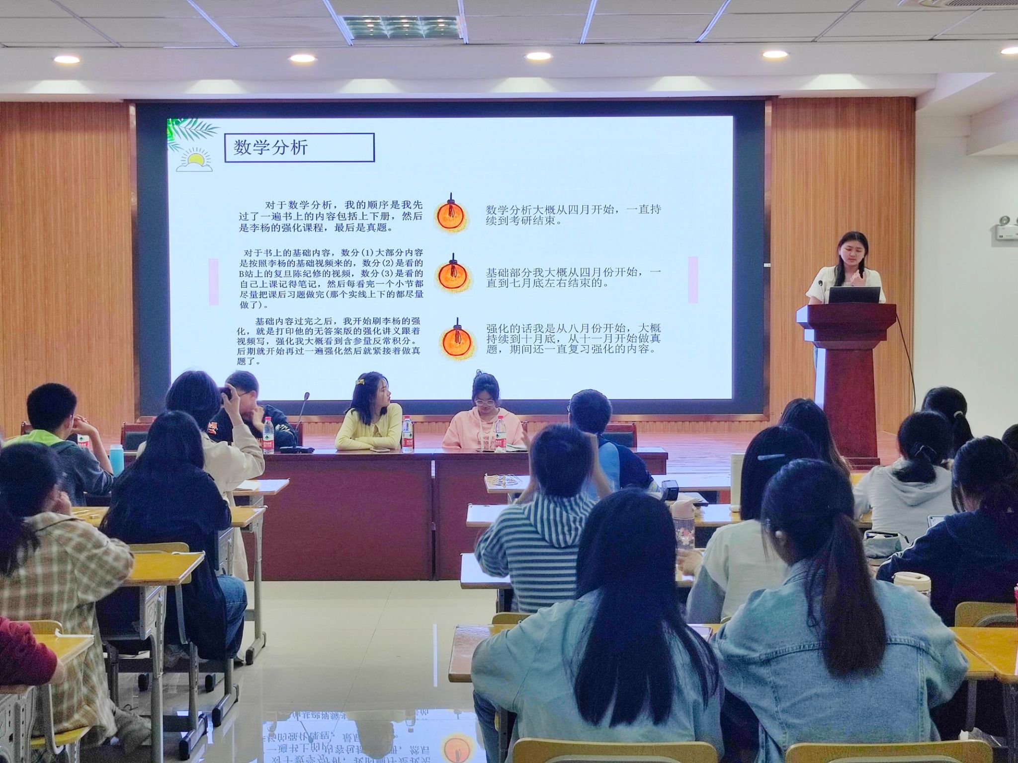 4月21日,太阳成集团tyc234cc于I楼401报告厅举办考研经验交流会,本次交流会邀请了学院5名数学与应用数学专业考研成功“上岸”学子为同学们分享考研经验。学院团委负责人和200余名学生参加此次活动。