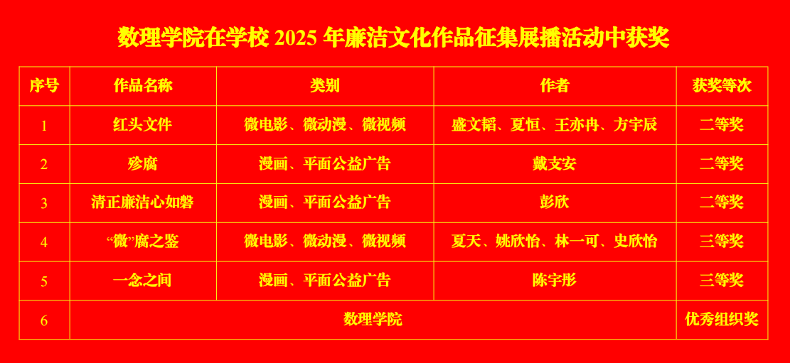 太阳成集团tyc234cc在2025年学校廉洁文化作品征集展播活动中获二等奖作品3件,三等奖作品2件,同时荣获本次展播活动优秀组织奖。(撰稿:余戡;审核:陆健)