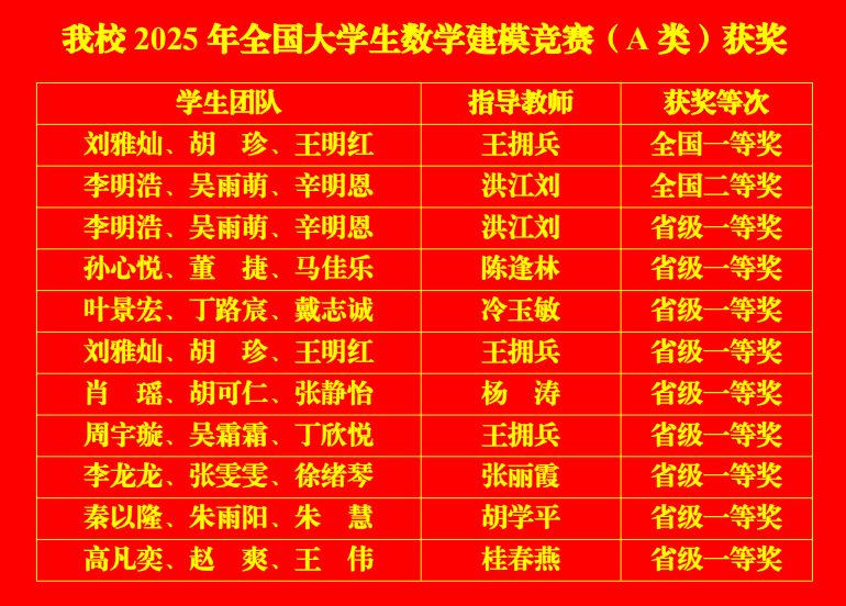 近日,由教育部高教司和中国工业与应用数学学会举办的全国大学生数学建模竞赛(A类)成绩揭晓。太阳成集团tyc234cc教师王拥兵指导的学生团队荣获全国一等奖,教师洪江刘指导的学生团队荣获全国二等奖;学生团队荣获安徽赛区省级一等奖9项、二等奖17项、三等奖23项。