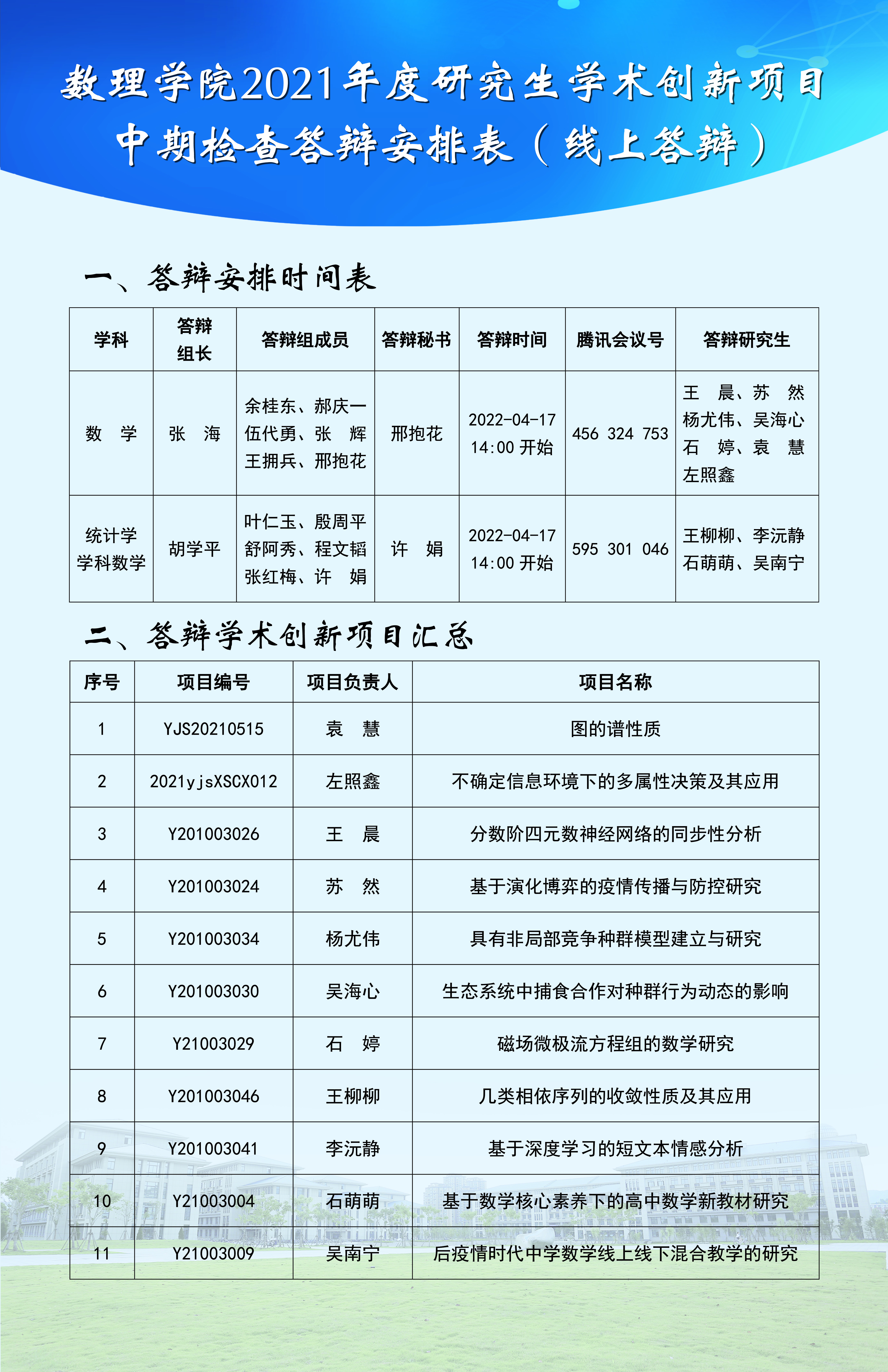 太阳成集团tyc234cc2021年度研究生学术创新项目中期检查答辩安排表