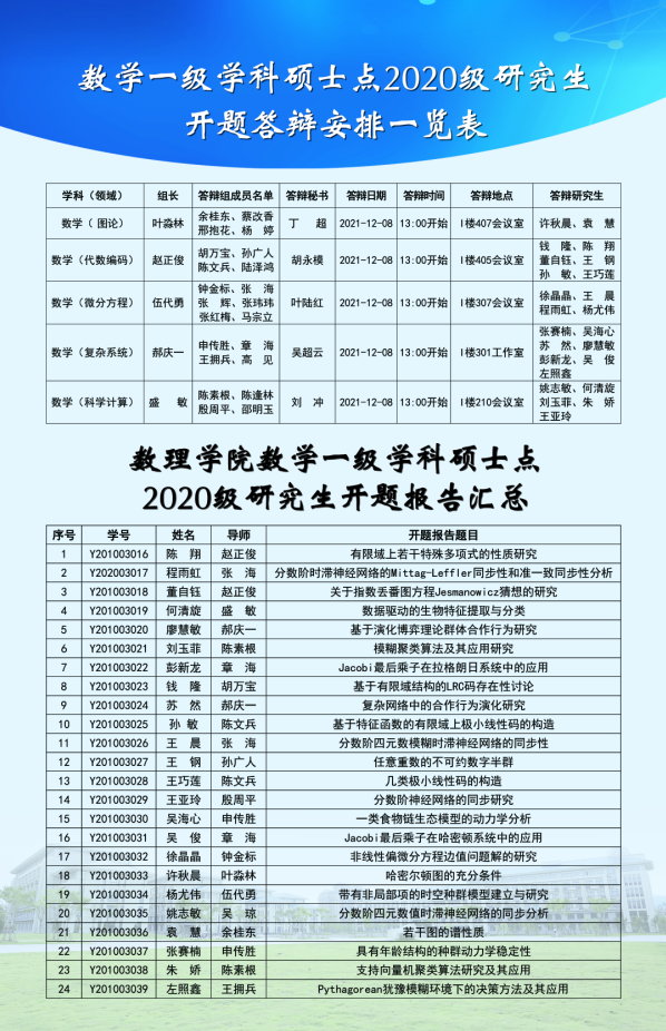 数学一级学科硕士点2020级研究生开题答辩安排一览表