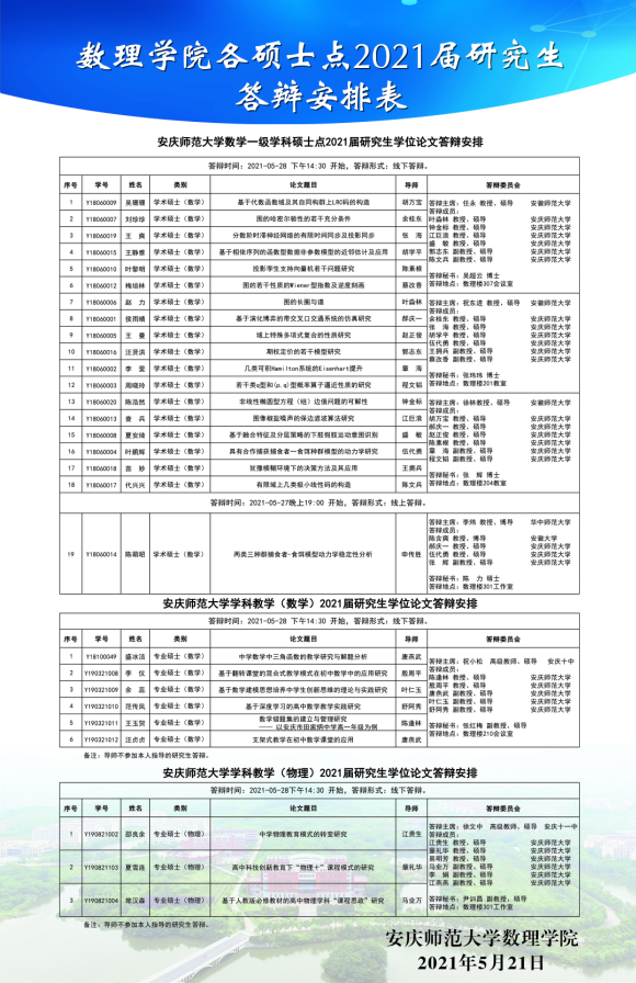 太阳成集团tyc234cc各硕士点2021届研究生学位论文答辩安排