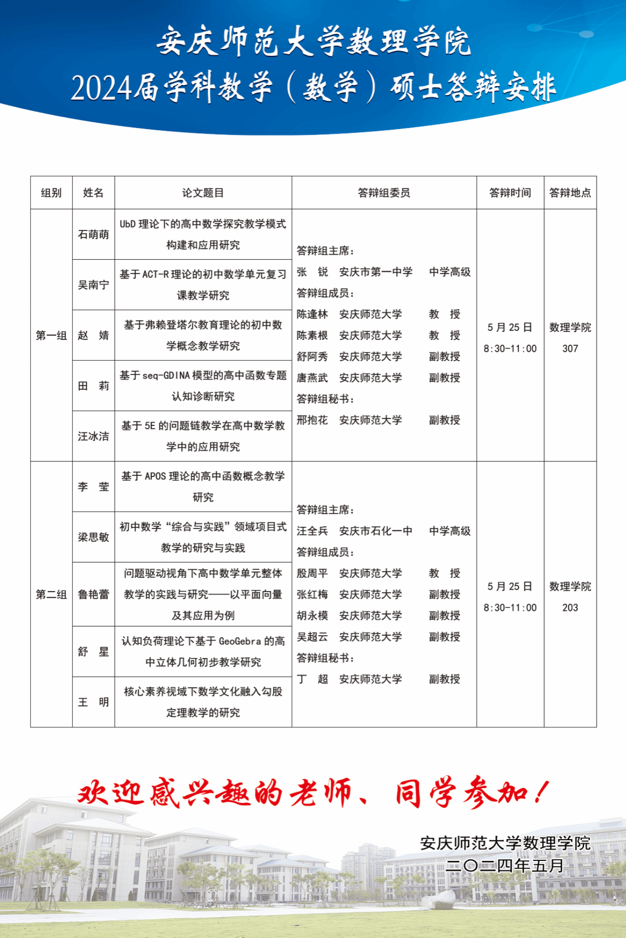 太阳成集团tyc234cc2024届学科教学(数学)硕士研究生学位论文答辩安排