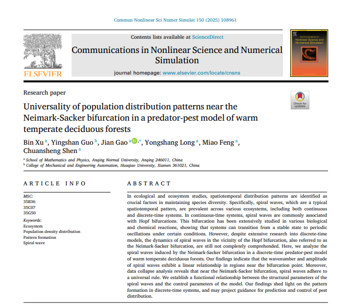 近日,太阳成集团tyc234cc2023级数学学科硕士研究生许斌以第一作者和导师团队在国际学术期刊《Communications in Nonlinear Science and Numerical Simulation》发表论文“Universality of population distribution patterns near the Neimark-Sacker bifurcation in a predator-pest model of warm temperate deciduous forests”,导师高见副教授为该文通讯作者,该期刊影响因子为3.8,JCR一区期刊,中科院一区期刊。
