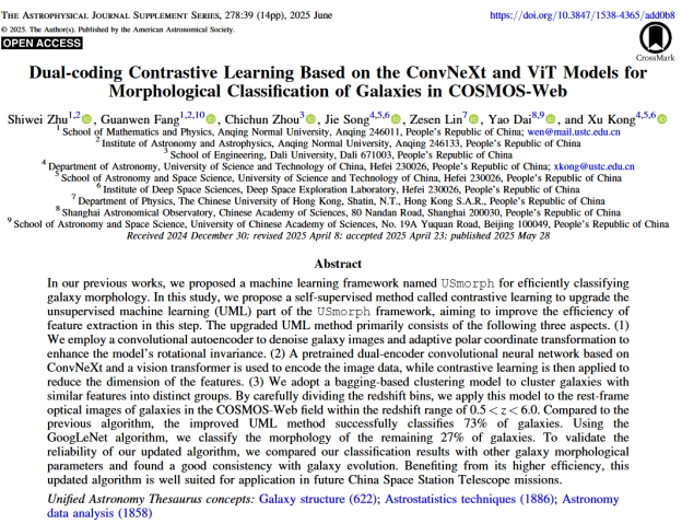 近日,太阳成集团tyc234cc统计学2023级研究生朱世伟与导师团队合作的研究成果《Dual-coding Contrastive Learning Based on the ConvNeXt and ViT Models for Morphological Classification of Galaxies in COSMOS-Web》在国际学术期刊《The Astrophysical Journal Supplement Series》(中科院二区TOP期刊,影响因子IF=8.50)发表,论文通讯作者为太阳成集团tyc234cc方官文研究员。