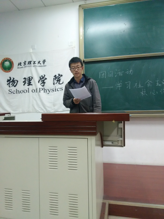 2014年11月15日下午,为了积极响应北京理工大学校团委关于“践行社会主义核心价值观”的号召,物理学院2014级全体新生在物理实验中心229联合举办了以“践行社会主义核心价值观”为主题的团日活动。本次活动由各班级团支部书记组织委员和宣传委员主持。