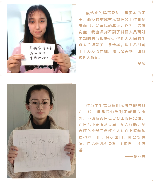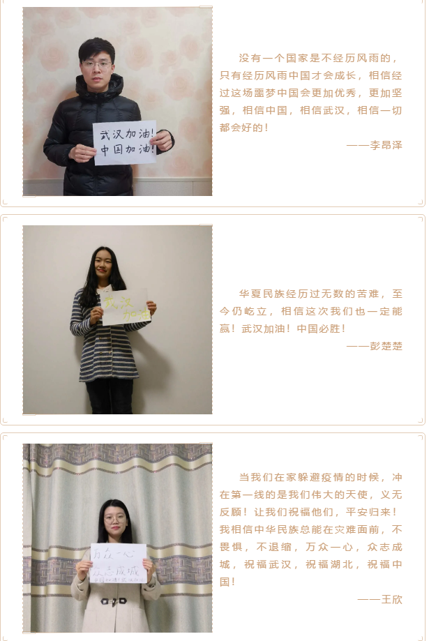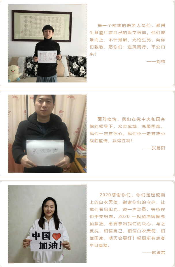 向一线抗击疫情工作人员表达敬意,坚定必胜信心,物理学院2017级硕士团支部开展了“众志成城 中国加油”主题团日活动,向疫区一线工作人员送上祝福。
