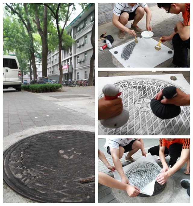 在毕业之际,为增强同学们对母校的归属感,结合七十五周年校庆,团支部同学开始遍寻具有学校历史的印记。通过细致的搜索,发现在学校中仍有十余个标有“北京工业学院制”字样的井盖,如何将井盖作为文化作品保留下来呢?同学们发现了即将失传的一项非物质文 化遗产技艺——“传拓”。