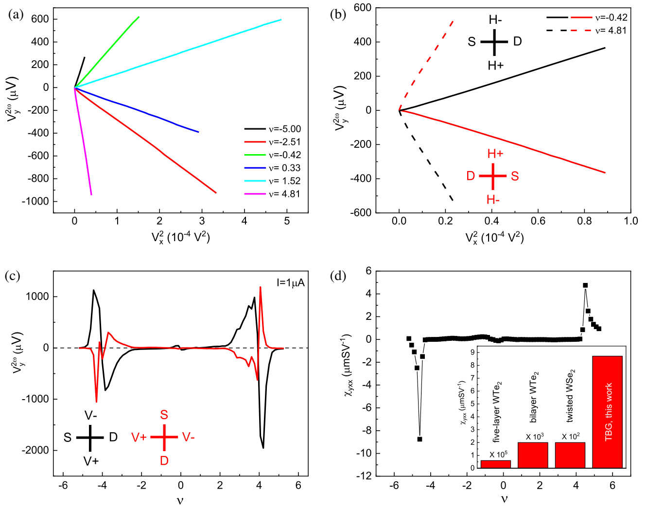 Recently, Yugui Yao and Junxi Duan’s group in School of Physics, Beijing Institute of Technology, report the observation of a giant second-order nonlinear Hall effect in twisted bilayer graphene. The result was published in Physical Review Letters.